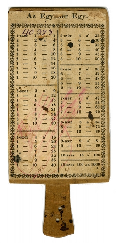 A másik oldalon Az Egyszer Egy látható táblázatba foglalva. Az 1-szer 1-től, a 10-szer 100 az 1000-ig a szorzótábla vár a skandálásra, biflázásra